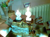 Poate veţi zice că e făcătură, că am obsesie pentru prăjituri, dar chiar aşa s-a nimerit: acesta e tortul prietenei mele, cu care împart apartamentul. Când a împlinit ea frumoasa vârstă, la 12 noaptea am băgat în boxe un La mulţi ani de scos vecinii din pepeni şi aşternuturi şi m-am prezentat cu două lumânări înfipte în două prăjituri. De înaltă calitate, nu prea înaltă canitate, însă, având în vedere regimul de austeritate din care se construieşte viaţa mea… era şi prea mult.