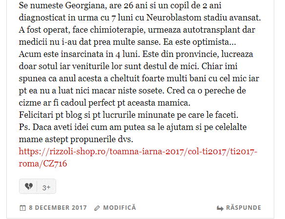Prietena mea Irina a avut un an greu pierzand o persoana draga ei. O mica bucurie ar merita din plin, cum ar fi aceste minunate botine: https://rizzoli-shop.ro/toamna-iarna-2017/col-ti2017/ti2017-roma/BO724. Craciun fericit tuturor!