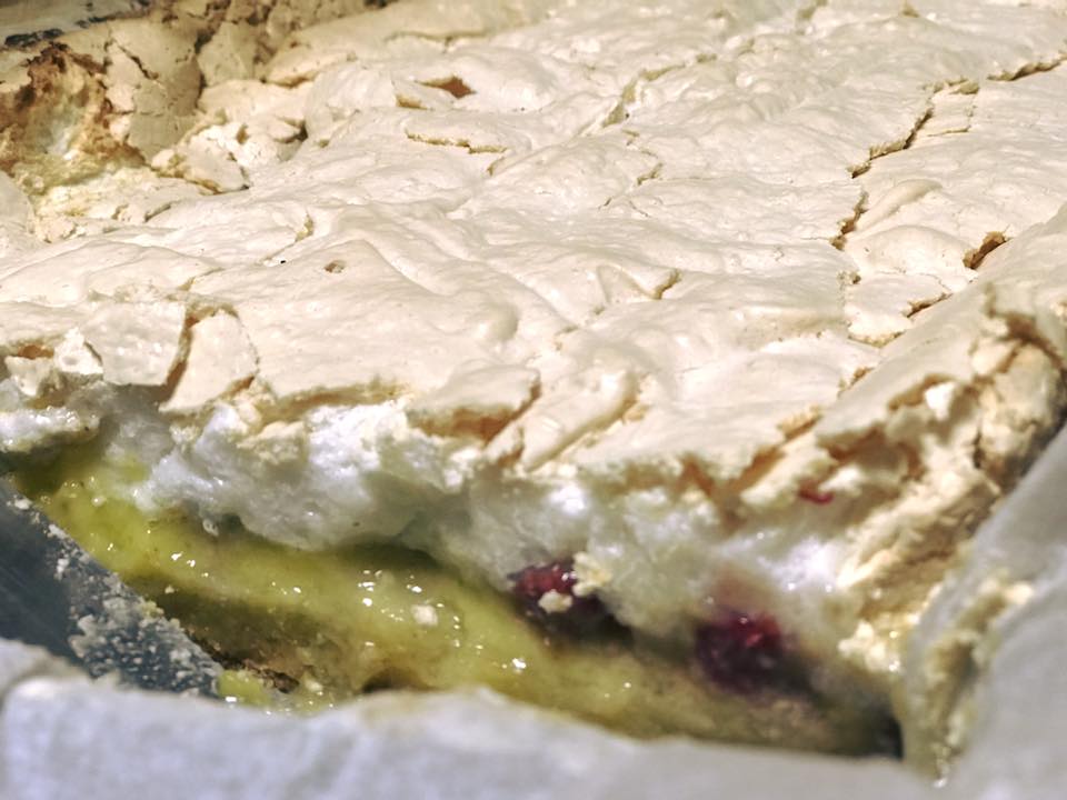 Când e aluatul nu de tot rece, se toarnă crema rrrrece peste aluat, se pun fructele peste cremă și albușurile bătute spumă deasupra. Și se dă la cuptor.