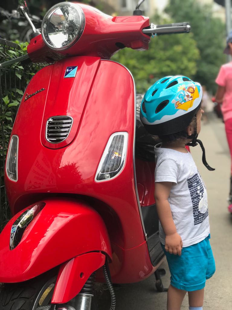 De când are scooter-ul ăsta din poză (haha, glumesc!), are și cască. I-am povestit de ea înainte s-o aibă. Cât e de importantă și de ce, îi mai povesteam de câte un pacient de-al lui Horațiu (o, da, nu vreți să știți! Sper că purtați cască!) și îl atenționam pe stradă când apărea câte cineva cu sau fără cască. La Sibiu în curte, când se dă pe motocicleta de plastic, e regulă să poarte cască. O dată a și luat o trântă zdravănă, de toată familia a zis: ce bine că avea cască!